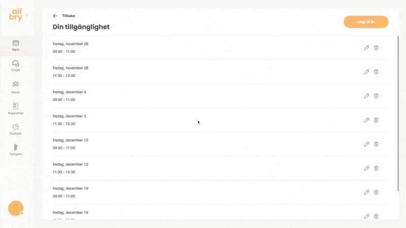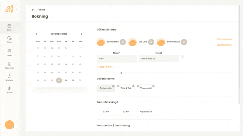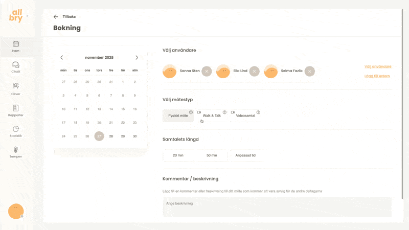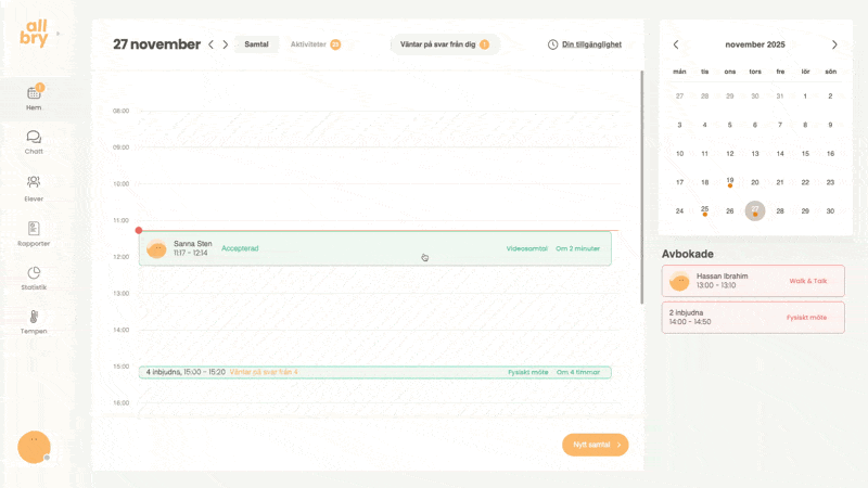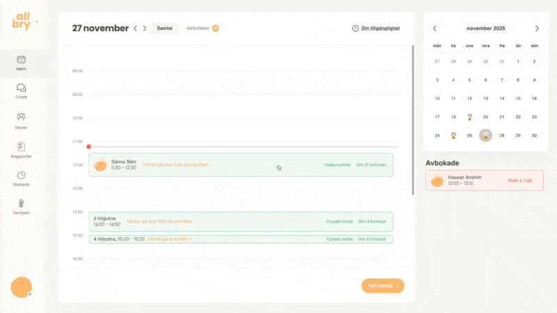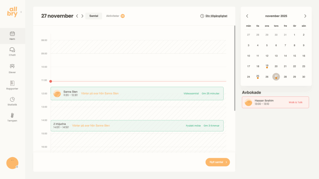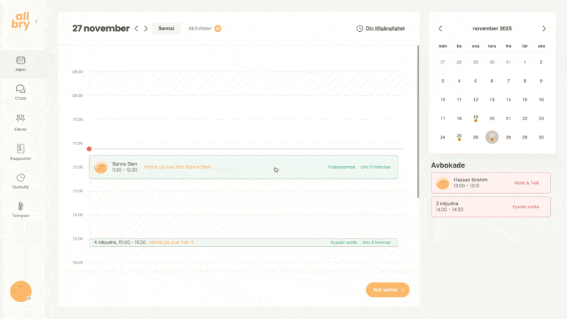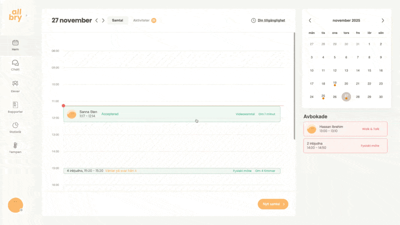 Allbrys bokningssystem gör det enkelt för både personal och elever att boka samtal på ett strukturerat och tryggt sätt. Du som personal kan: