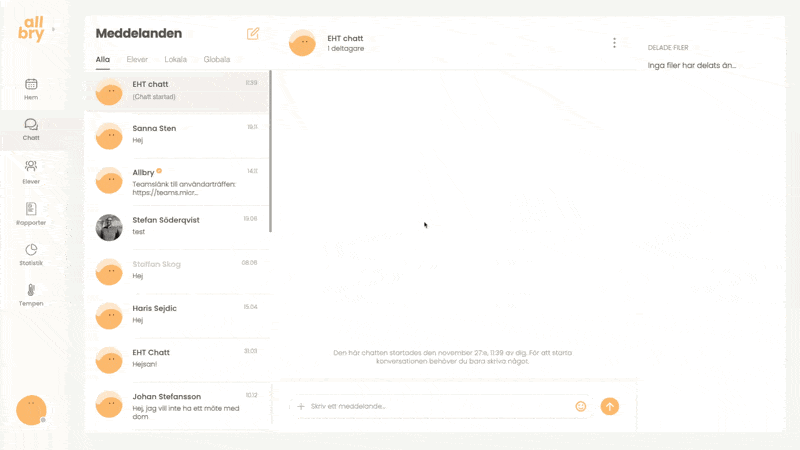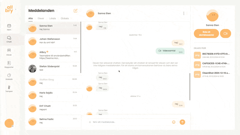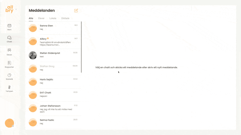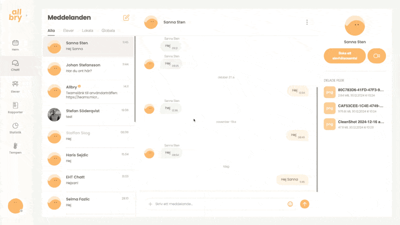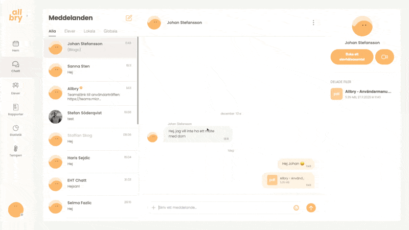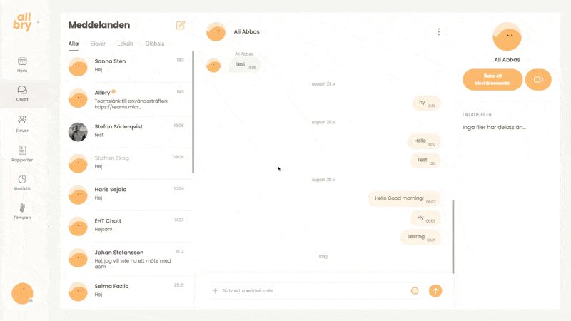 Chatten i Allbry är ett tryggt och flexibelt sätt för elever och personal att kommunicera. Funktionen är utformad för att passa både elevens och skolans behov och innehåller flera smarta funktioner som bildstöd, gruppchatt, bilagor, läskvittenser, notiser och möjlighet att starta videosamtal direkt från chatten.
