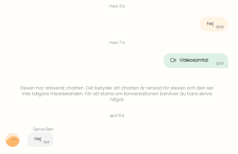 - Eleven kan alltid ta bort chatten från sin egen vy (se arkivering ovan) men du ser alltid dem.