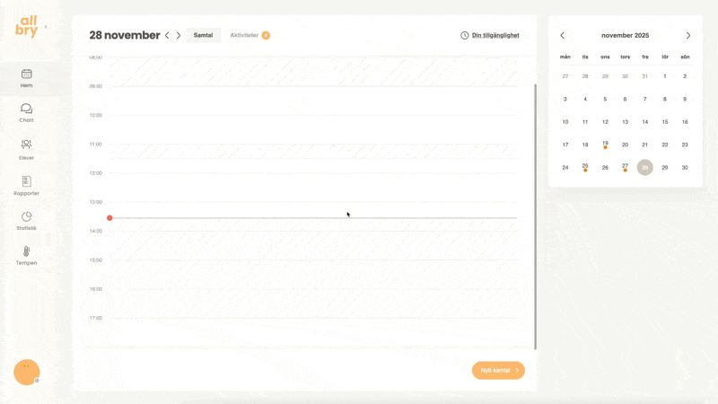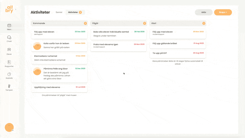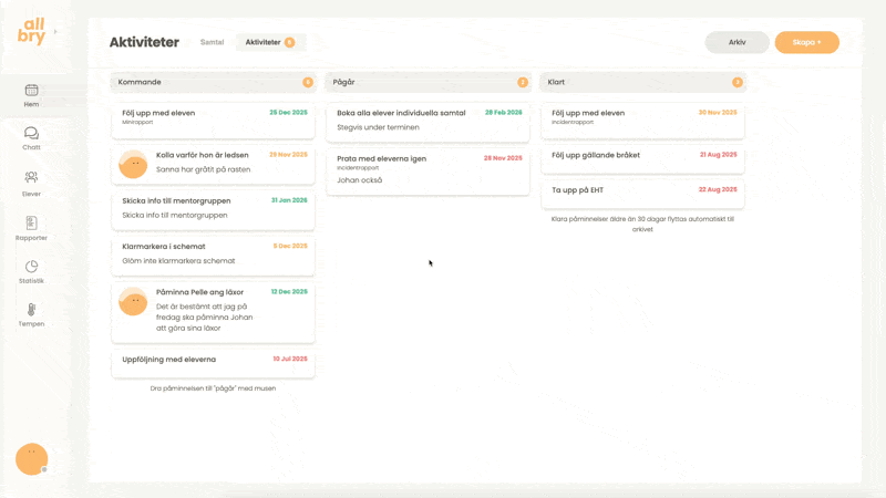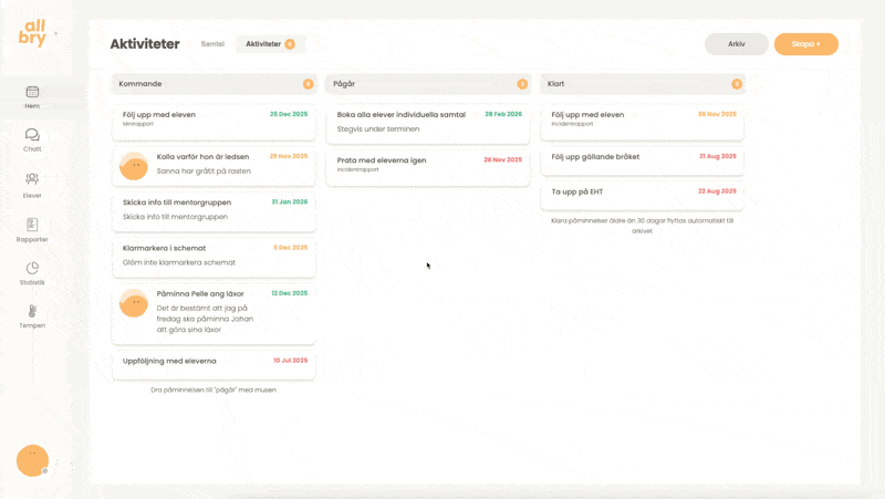 Påminnelser/aktiviteter är ett arbetsstöd som hjälper dig att hålla koll på uppföljningar, uppgifter och elevärenden över tid. Funktionen fungerar som en tydligt uppdelad planeringsvy där du kan: