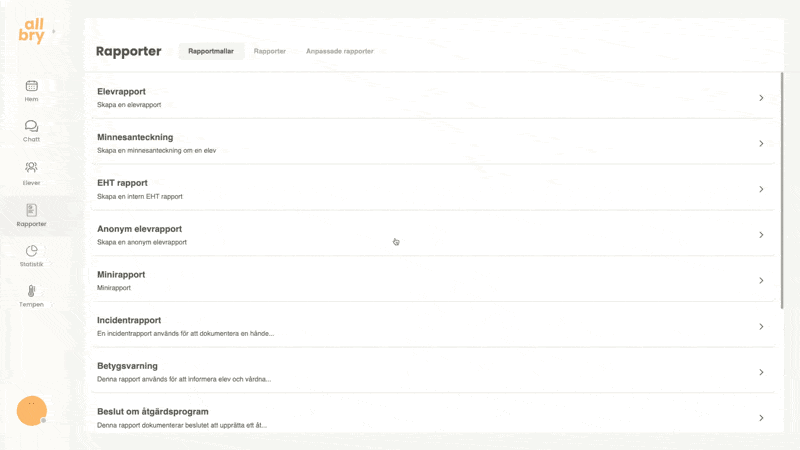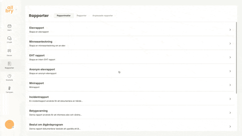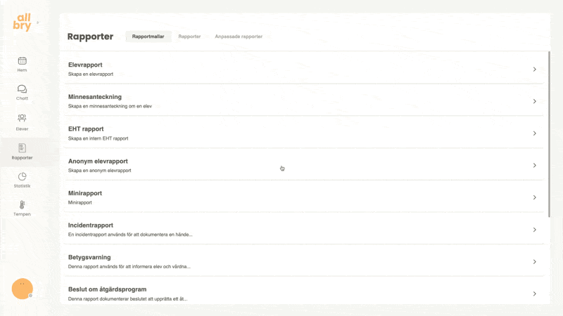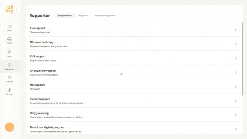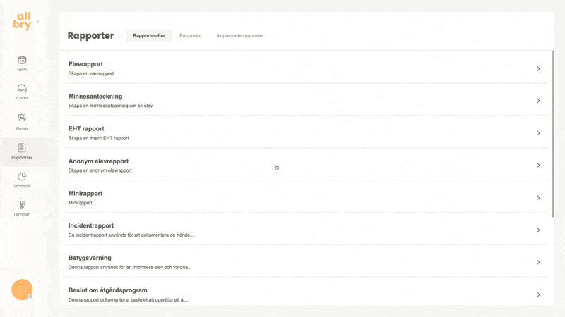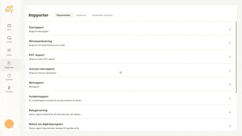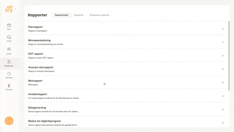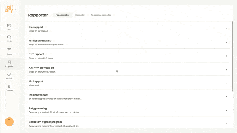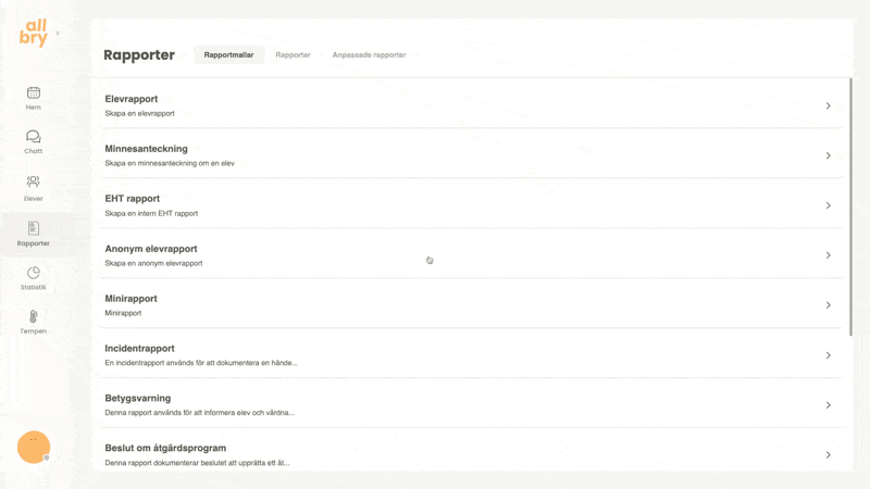 Rapporteringen i Allbry är utformad för att stödja elevhälsoteamets arbetsprocesser på ett säkert, effektivt och överskådligt sätt. Här kan du dokumentera allt från korta minnesanteckningar efter ett chatt-, fysiskt- eller videosamtal till större och mer avancerade rapporttyper som åtgärdsprogram, EHT-rapporter eller incidentrapporter.