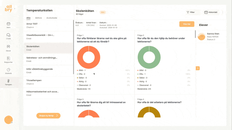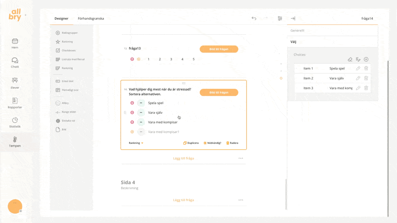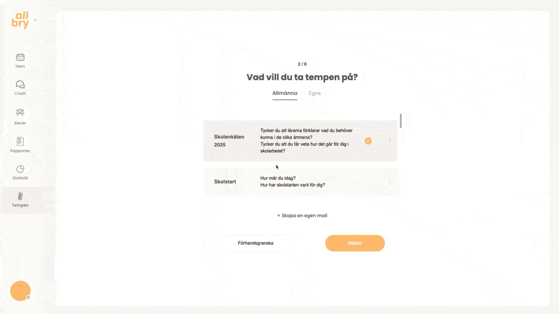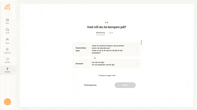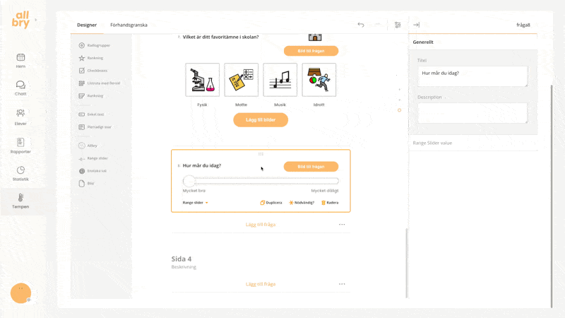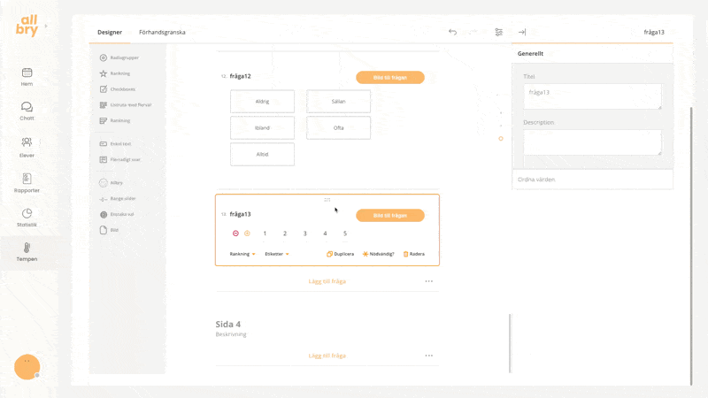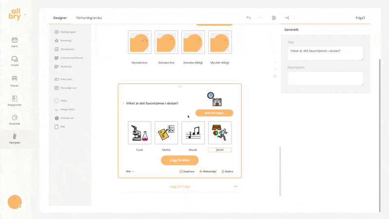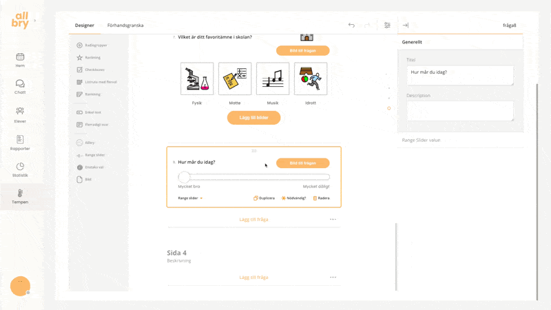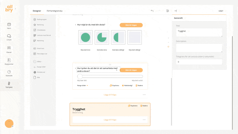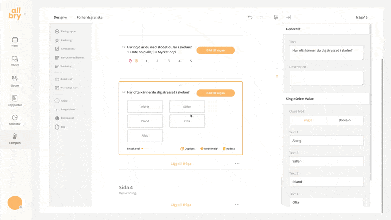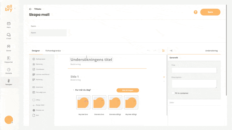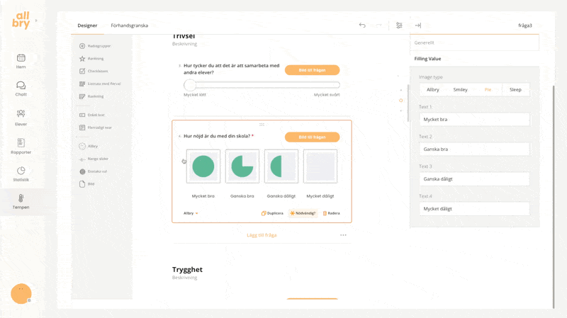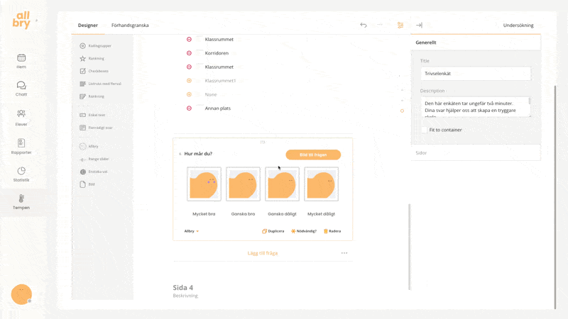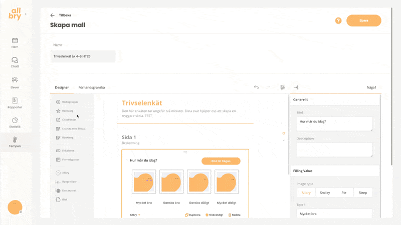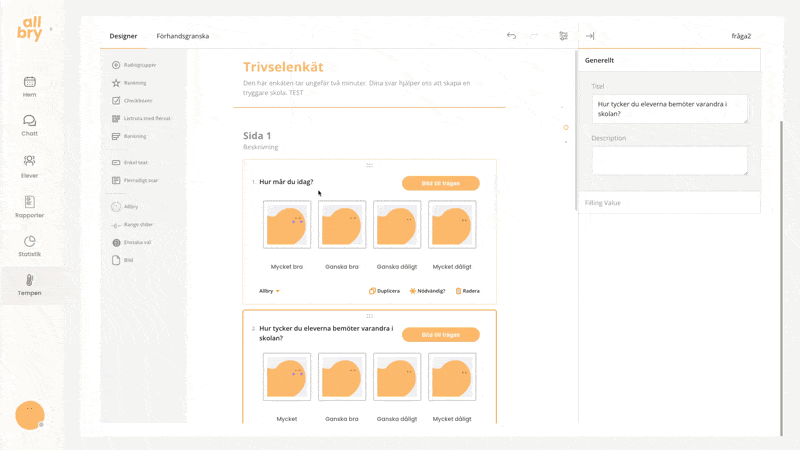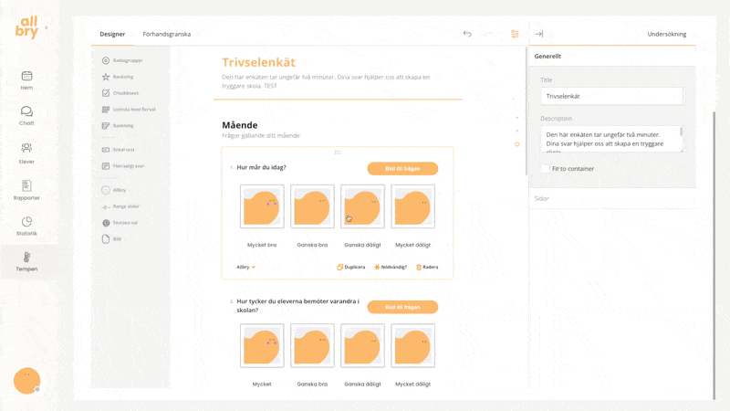 När du skapar en enkät eller check-in i Allbry används ett kraftfullt och flexibelt verktyg som vi har anpassat för att passa skolans arbetssätt, språkliga behov och elevvänlig visuell design.