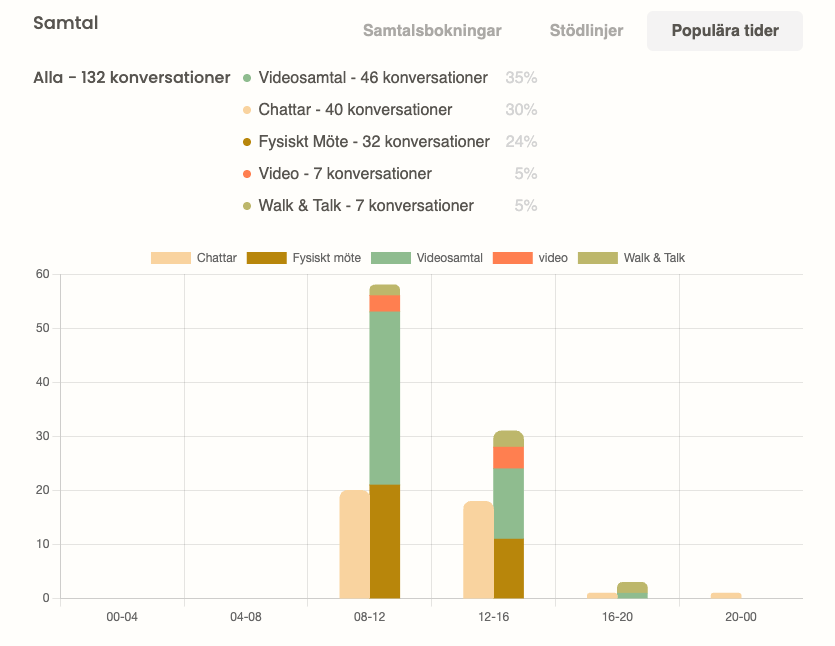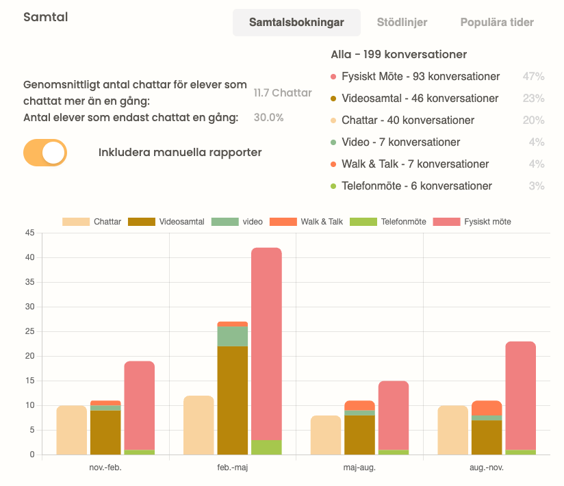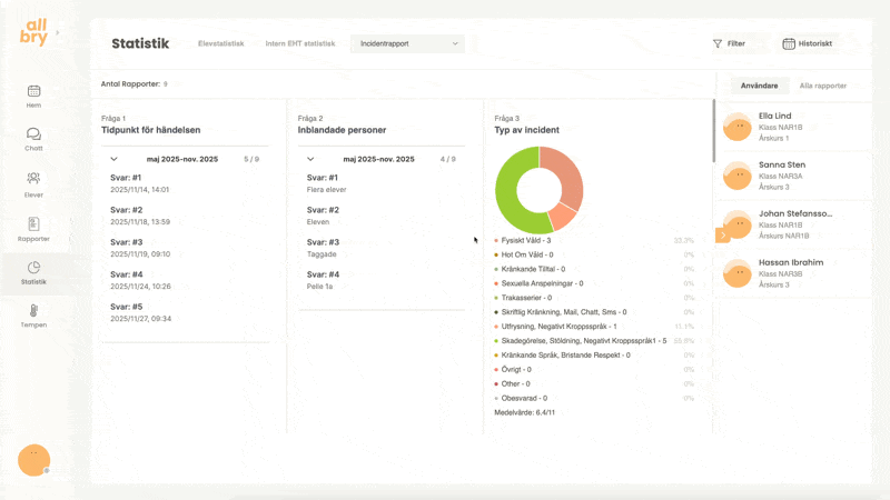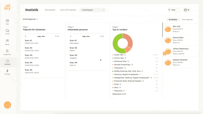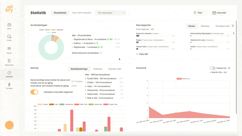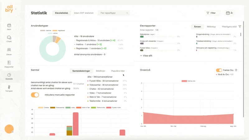 Statistik- och kartläggningsvyn i Allbry ger skolor och kommuner en unik insyn i elevernas välmående, kontaktmönster, samt vilka typer av stöd som efterfrågas. Statistiken genereras automatiskt från:
